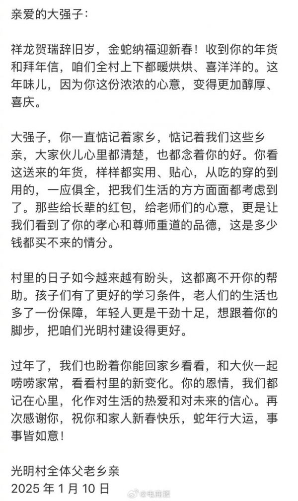 #光明村村民给刘强东写感谢信# 光明村全村给刘强东写感谢信了,还有村民送了锦旗。