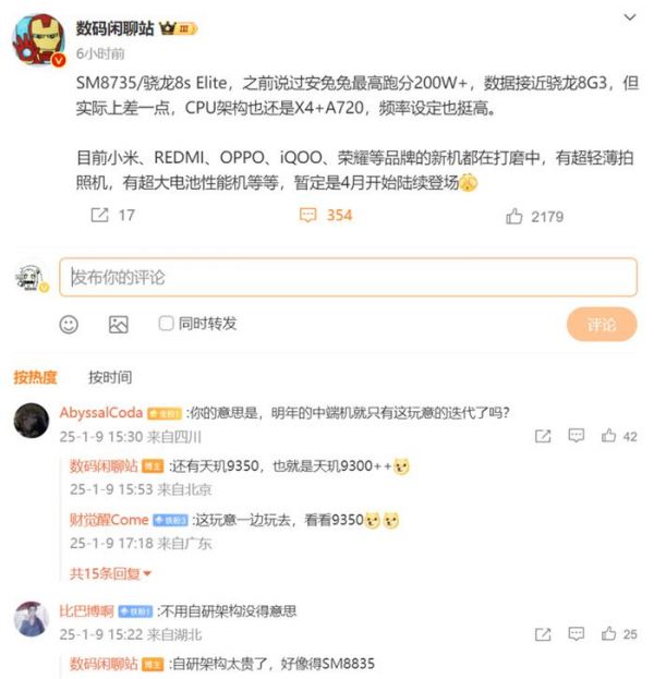 不过,骁龙8s Elite的竞争对手也不少,比如天玑8400处理器、天玑9350处理器,都会对其造成一定的压力。