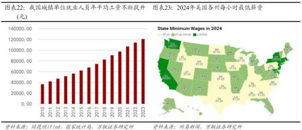 用工成本攀升凸显机器换人性价比。近年来,伴随着经济水平的不断提升和人口老龄化程度的日益加重,我国劳动力成本明显提升,我国城镇单位就业人员年平均工资从2010年36,539元涨至2023年的120,698元;美国最低时薪不断提高,目前美国境内的最低时薪为每小时7.25美元。在规模效应下机器人生产成本将逐步降低,“机器替人”大势所趋。
