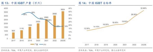 中国IGBT产量持续提升,带动自给率不断增加。基于中国核心元器件国产化的要求,国产替代成为国内IGBT的发展趋势。2018年,中国IGBT产量约为1115万只,预计2023年增加至3624万只,CAGR为26.6%,自给率也从14.10%提升至32.90%。未来在人形机器人的增量需求下,中国IGBT需求将有望得到进一步释放。