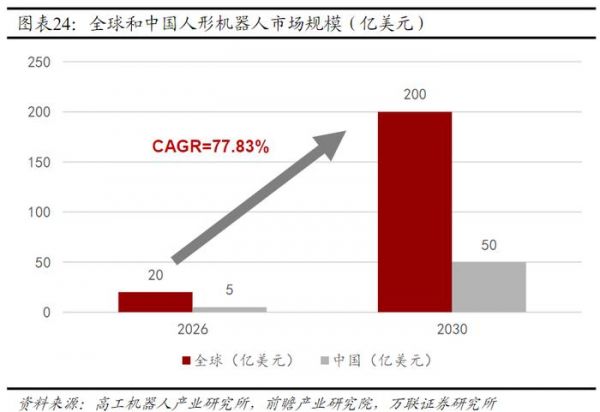 人形机器人未来市场潜力大,随着技术进步、成本降低以及社会需求的增加,其在工业生产、家庭服务、养老护理、医疗辅助、教育娱乐等多个领域都有望实现广泛应用,未来人形机器人在提供辅助服务、提高生活质量方面的作用将变得更加重要。根据高工机器人产业研究所,2026年全球人形机器人市场规模预计超20亿美元,到2030年全球市场规模有望突破200亿美元。