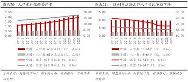 全球老龄化催化人形机器人需求。经济发展、寿命延长与生育率降低致全球老龄化加剧。根据国家统计局数据,我国2023年65岁及以上人口达2.17亿,占比从2010年8.9%升至15.4%,目前已处于老龄化社会;劳动人口由2013年10.1亿减至9.62亿,未来随着长期累积的人口负增长势能进一步释放,中国老龄化程度将进一步加剧,人口红利逐步消失。根据世界银行数据,美国65岁及以上人口占比从2010年13.03%升至2023年17.59%,适龄工作人口占比降至64.97%,劳动力不足日益凸显。全球劳动力市场供需趋紧,催生机器代人需求。
