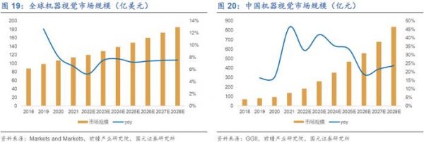 机器视觉是指用计算机来实现人的视觉功能,人形机器人是机器视觉的重要应用领域。机器视觉主要由光学成像、图像传感器、图像处理、输入输出以及显示模块五大核心组件构成。据Markets and Markets数据,2024年全球机器视觉市场规模预计在139亿美元,2028年有望提升至185亿美元,CAGR为7.4%。中国机器视觉发展速度较快,高于全球增速水平,据GGII数据,预计2024年中国机器视觉市场规模为352亿元,2028年将提升至837亿元,CAGR可达到24.2%。