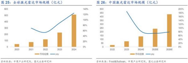 人形机器人对环境感知有宽视场、高速度和高精度的各种要求,但目前技术路径尚未完全确定,国外特斯拉Optimus主要以多目视觉为主,国内人形机器人厂商多采用3D相机+激光雷达方案,宇树、达闼等多家人形机器人采用激光雷达解决方案,将带动激光雷达需求。据中商产业研究院数据,2024年全球激光雷达市场规模可达到521亿元,同比增加126%。随着国内人形机器人陆续进入量产阶段,将提振激光雷达需求,据Frost & Sullivan数据,中国激光雷达市场规模有望从2024年的140亿元增加至2026年的432亿元,CAGR达到75%。