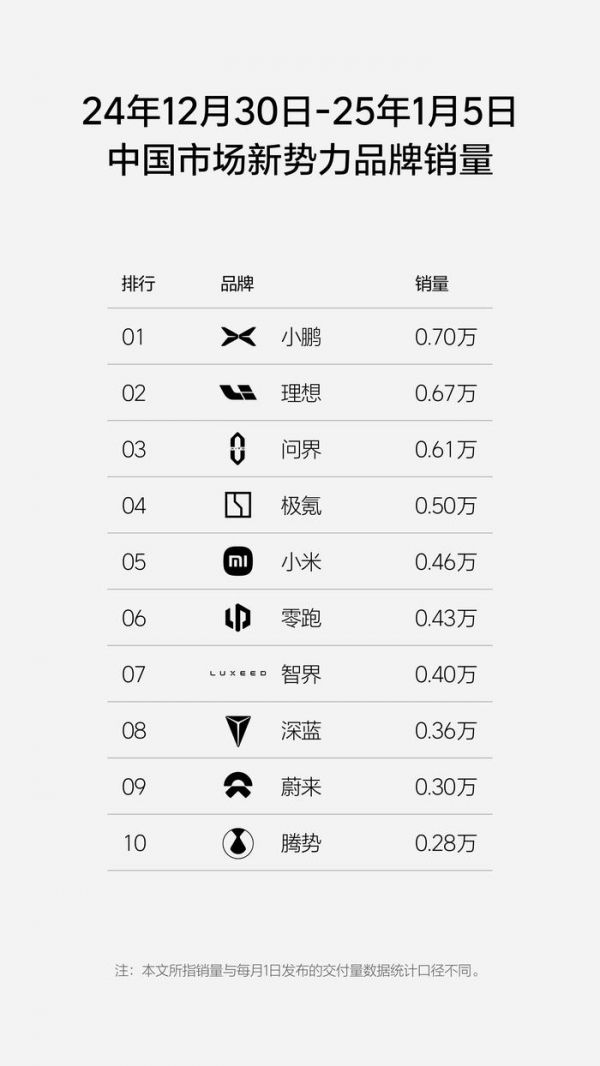 2025年第一周,小鹏汽车超越理想汽车,成为新势力品牌周销量冠军。