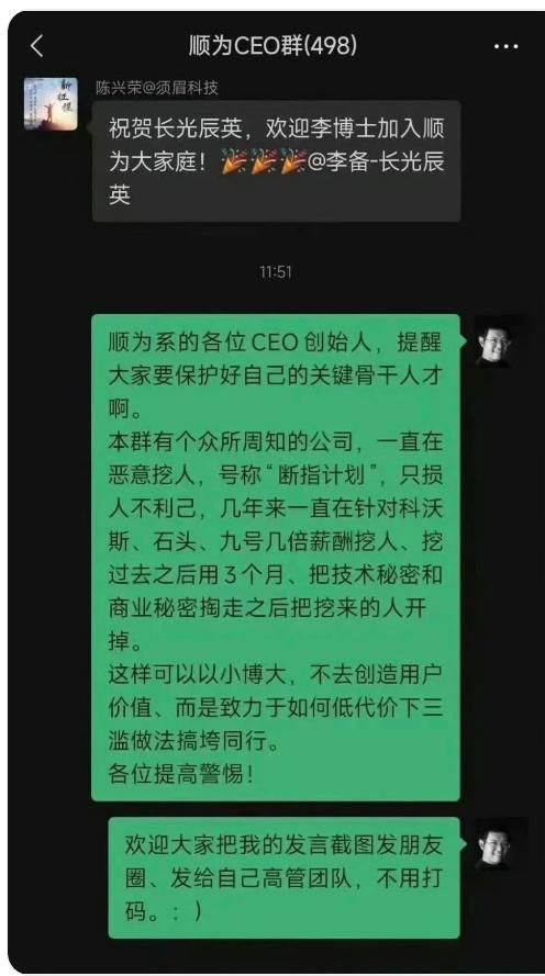 此前,一张“顺为CEO群”的聊天截图在网络上流传。截图显示,群中有人称:提醒顺为系的各位 CEO 创始人,提醒大家要保护好自己的关键骨干人才。“本群有个众所周知的公司,一直在恶意挖人,号称‘断指计划’,只损人不利己,几年来一直在针对科沃斯、石头、九号几倍薪酬挖人、挖过去之后用 3 个月、把技术秘密和商业秘密掏走之后把挖来的人开掉。”