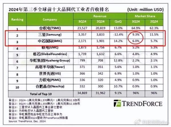 而在成熟芯片上,三星又面临来自中国大陆厂商的价格战,所以营收也是下滑,数据显示,三季度在芯片代上业务上,三星下滑了12%,是前10大厂商中,唯一下滑的。