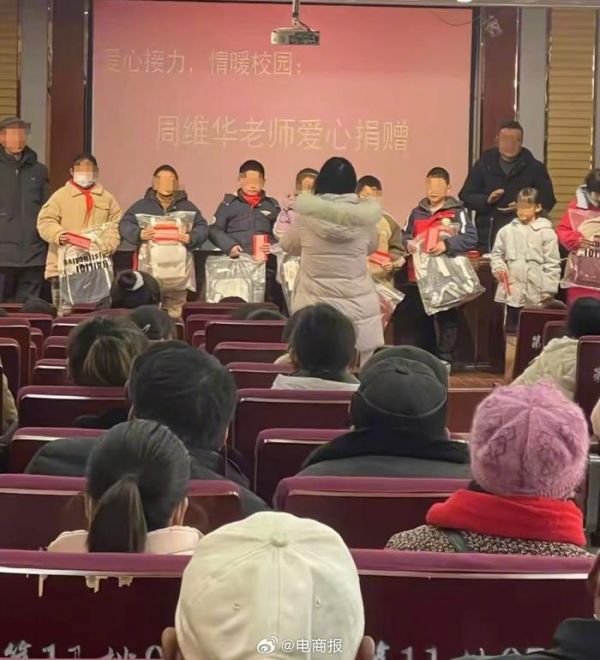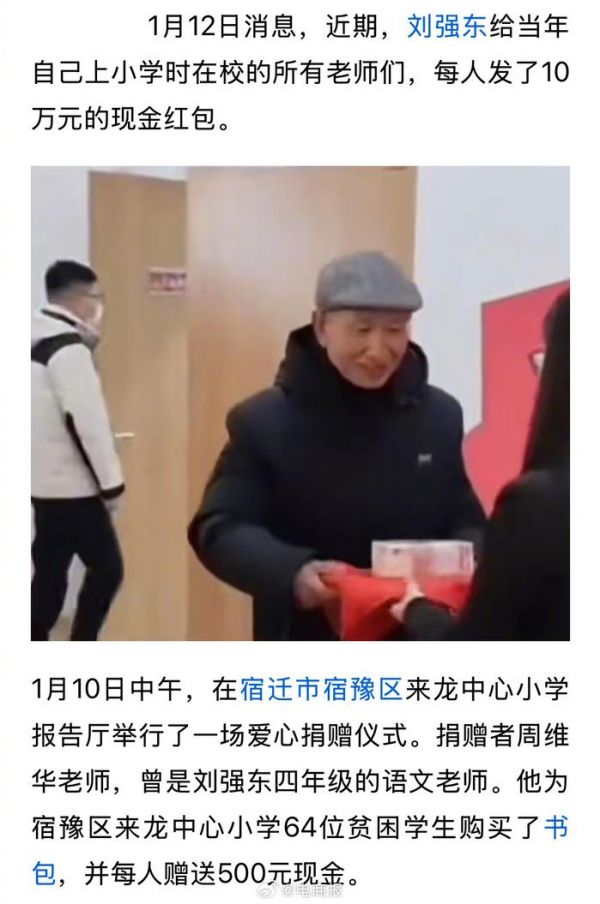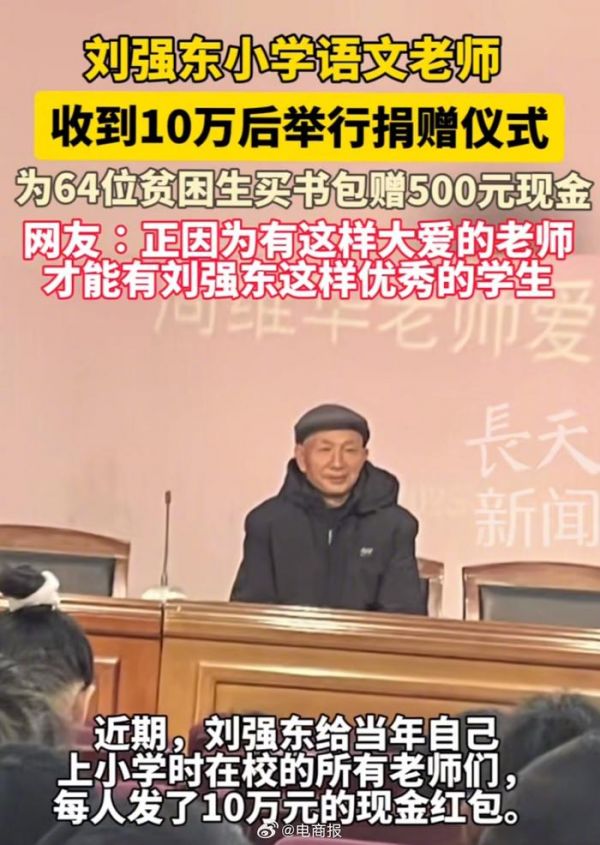 刘强东老师收到10万元后举行捐赠仪式:为64位贫困学生购买书包…