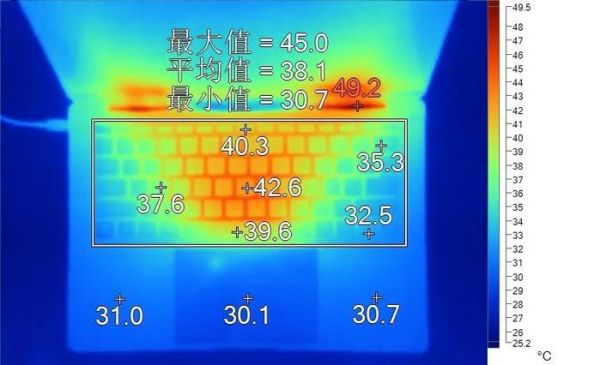 表面温度如上图所示,键盘键帽最高温度出现在“H”键,为42.6℃,WASD键为37.6℃,方向键32.5℃。左腕托温度为31.0℃,背面中心点36.1℃。