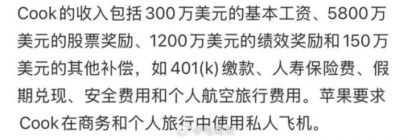 #库克2024年薪酬达7460万美元# 库克薪涨至7460万美元,被苹果要求在商务和个人旅行中使用私人飞机。
