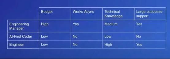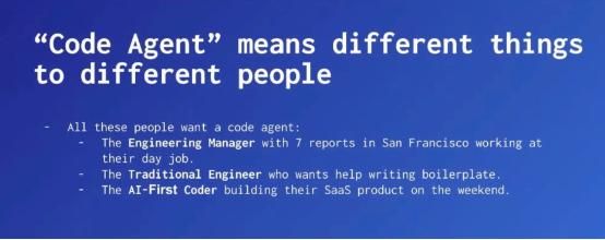 不同用户群体的需求差异非常大。例如,一位工程经理可能关注如何高效地管理大型项目和团队,使用智能体异步处理大量任务,并且在处理复杂的代码库时能获得帮助;而 AI-First 工程师和传统工程师则希望工具能够实时响应,帮助他们更好地编写代码或构建产品。对于后者来说,实时反馈和灵活性比传统的异步工作模式更为重要。