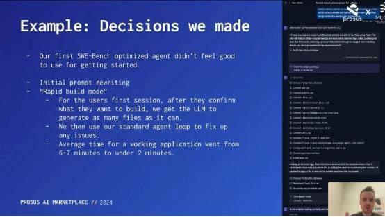 为了解决这个问题,我们引入了快速构建模式(Rapid Build Mode),在这个模式下,我们不再使用传统的智能体循环,而是通过尽可能快速地输出内容来启动问题的解决过程。我们提供了一些模板和指导,并使用了一些自定义的提示。这样,智能体可以快速生成 10 到 15 个文件,虽然这些文件有些小问题,但用户可以通过传统的智能体循环来修复它们。最终,这个改进使得我们把一个需要六到七分钟才能开始的工作应用程序,缩短到了不到两分钟,大大提高了效率。