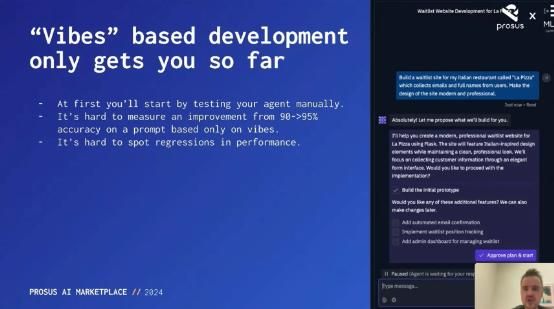 大家可以看到右边这个例子,用户给出的输入是:“为我的意大利餐厅 La Pizza 构建一个等待名单网站,收集用户的电子邮件和全名,并且让网站的设计现代且专业。”接着,智能体会回应说将使用 Flask 来构建这个网站。然后用户就可以说,“嘿,其实我希望你使用 Express”,然后智能体会回应:“太好了,咱们在开始构建之前把这个弄清楚了。”
