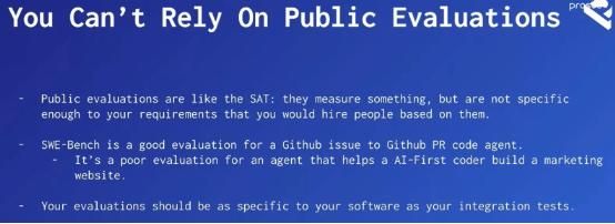 另一个问题是,你不能完全依赖公开的评估标准。公开评估就像 SAT 考试,它衡量的是一些重要的东西,但它并不具体到某项工作或你的需求,就像你不会仅仅根据 SAT 成绩就决定是否雇佣某个人。很多公开评估在某些特定问题上很有效,但对于你的问题可能并不合适。例如,SWE-Bench 非常适合用于 GitHub PR 编码智能体,但它并不适合评估帮助 AI-First 工程师建立营销网站的智能体,对于这种情况,用户可能会说:“哦,你把图片放在了左边,可以把它移到右边吗?或者换成棕榈树代替森林?”而这并没有公开的基准评估供使用。