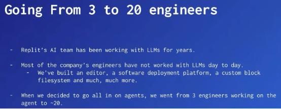 Replit 多年来构建了很多软件,但其中并没有涉及 LLM 技术。这意味着我们有一支非常优秀的工程师团队,但并没有处理 LLM 的经验,因此我们面临着一个非常陡峭的学习曲线,需要尽快帮助这些工程师提升技能。
