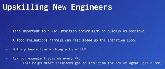 代码审查也是一种非常有效的帮助团队成员更好地理解代码库和提升技能的方法,注意确保每个涉及智能体的 PR 都包含相关的轨迹,这能够帮助其他工程师更好地理解智能体如何使用特定的工具,并进一步培养他们的直觉。