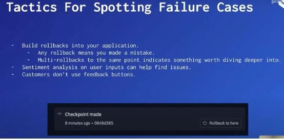 我们发现回滚策略非常有效。每次回滚意味着你犯了一个错误——任何回滚都意味着你犯了一个错误,无论是用户没有明确指定他们的需求,导致智能体做了错误操作,还是智能体卡住了,用户想要重新开始。如果你记录下每次回滚的情况,以及某个特定点被回滚的频率,那么这就能成为一个非常清晰的信号,表明智能体存在问题,工程师就可以深入调查,尝试理解问题所在。
