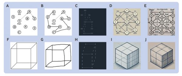 连线测试和正方体绘制测试,A和F是正确答案,B和G是人类给出的答案,其余是AI模型的答案。|图源:论文