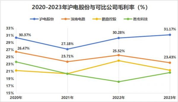 毛利率方面,能明显看到,2020-2023年沪电股份的毛利率,长期高于深南电路、鹏鼎控股、胜宏科技等公司。净利率表现也是如此,同一时间段内,沪电股份净利率大多维持在16%以上,高于其他可比公司。