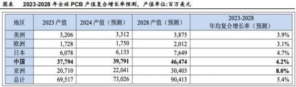 2023年全球PCB市场规模为695亿美元,预计2024年增至730亿美元、2028年增至904亿美元,2024-2028年的年复合增长率在5.4%。