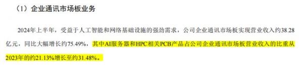数据显示,2024上半年,沪电股份AI服务器与HPC业务大幅增长,收入占通讯市场板比重持续增加。
