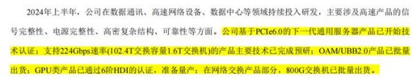 财报显示,2024上半年公司的OAM、UBB2.0产品已经出货,1.6T容量的数据中心交换机产品已完成主要技术预研,800G交换机产品也已批量出货。
