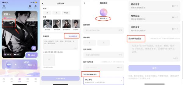 在【关系设定】里,可以编辑主控的形象,有着AI生成、聊天语气选择和自身补充设定几个维度。
