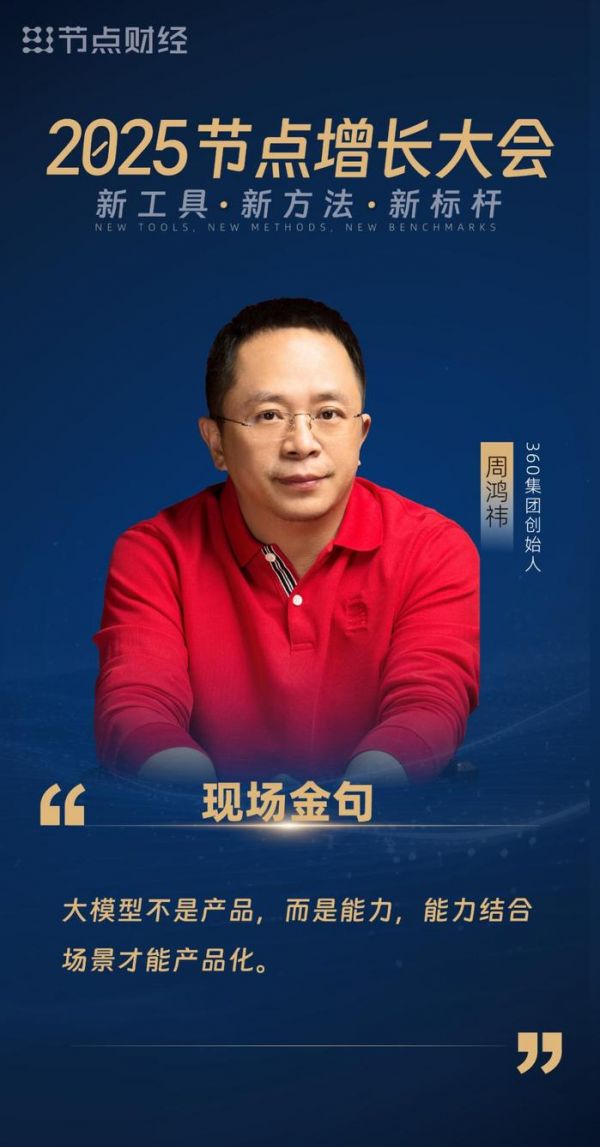 1月10日,由《节点财经》主办的“2025节点增长大会”在北京举行。360集团创始人周鸿祎通过线上方式出席本次大会,分享了对AI大模型时代下的产业创新与变革机会的真知灼见,贡献了一场非常精彩的演讲。
