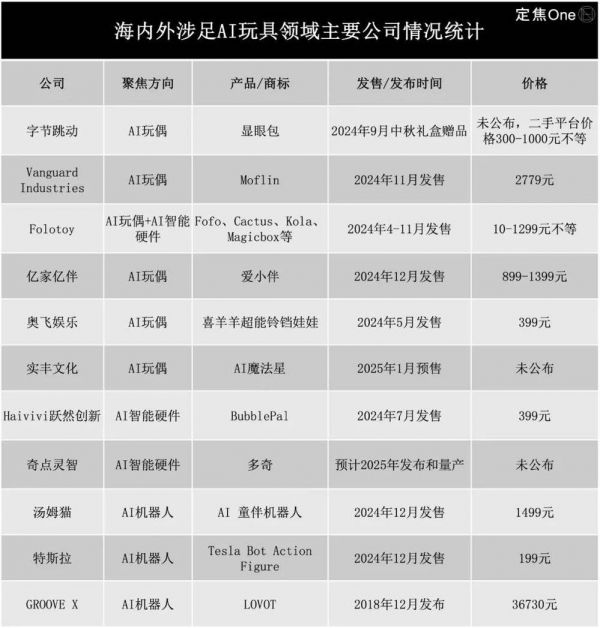 要解答这个问题,我们还得从产品入手。为此,“定焦One”梳理了目前入局AI玩具的公司以及它们产品的主要信息: