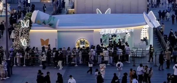 杭州西湖畔的湖滨银泰 in77,前阵子迎来了一波新的热闹:一家奶茶快闪店大排长龙,动辄要等待上 2 个小时。店员将茶包放入手冲壶中萃取。三分钟后,店员将茶汤、牛奶杯和含有茉莉纯露的配料一起倒入杯中,一杯奶茶就做好了——整个过程颇具仪式感,因限购 2 杯,顾客可以直接购买零售款轻乳茶带回家自己完成。