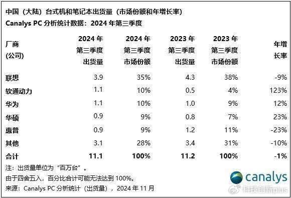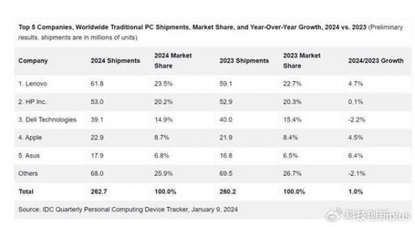 PC销量:联想全球和中国都第1,华为中国第3,全球其它