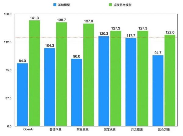 第三梯队模型 DeepSeek-r1-lite、Kimi-k1、Tiangong-o1-preview、DeepSeek-v3 的表现也不差,分数均在 120 分以上。