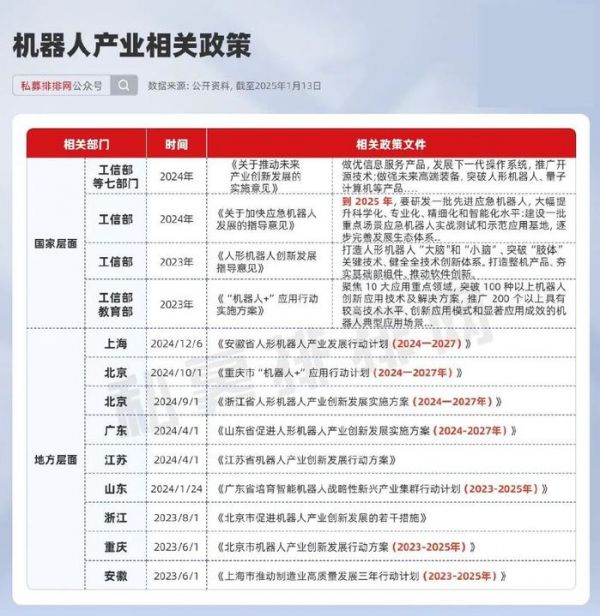 从需求端来看,当前老龄化趋势加剧、全球人力成本不断攀升,机器代人需求也迅速增长。再者,人形机器人作为科技竞争的新赛道、新质生产力的重要抓手,应用前景广、发展潜力大。为此,自2023年以来,国家和地方层面纷纷围绕人形机器人产业制定政策,明确规划到 2025 年、2027 年的预期成果,同时给予全方位的扶持。
