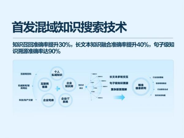 更值得一提的是,讯飞星火还推出了行业首发的混域知识搜索技术。具体来说,该技术能对实现对个人知识、企业知识、业务系统数据、精品行业数据以及互联网信息的综合搜索,解决了用户在不同知识领域之间综合查询的需求,一次提问即可获得全面的答案。