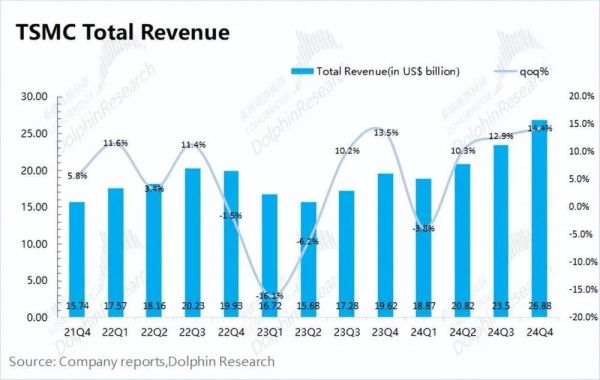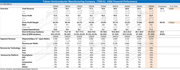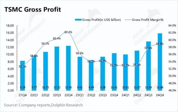 台积电(TSMC)于北京时间2025年1月16日下午的美股盘前发布了2024年第四季度财报(截至2024年12月),要点如下:
