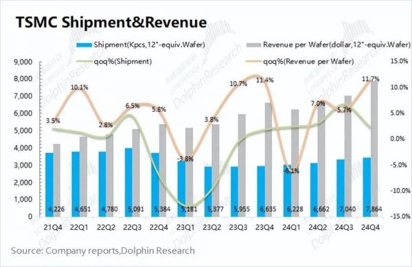 (2)价的维度:2024Q4台积电的单晶圆收入(等效12寸片)为7864美元/片,环比提升11.7%。台积电晶圆出货均价上升,主要是得益于本季度3nm和5nm制程占比的提升。本季度公司7nm以下制程收入占比已经提升至74%。