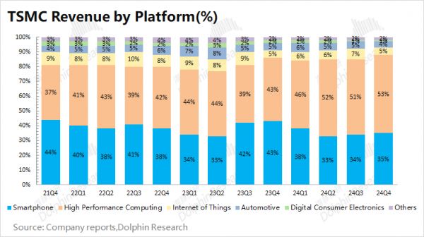 智能手机和HPC是台积电最大的收入来源,两者合计占比达到88%,是公司下游收入的最大来源。