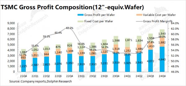(3)可变成本(其他制造费用):2024Q4台积电平均可变成本约1682美元/片,环比增加272美元/片。随着3nm及5nm产品占比提升,单位可变成本呈现趋势性提升的情况;