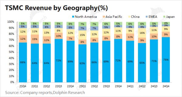 3. 晶圆结构端:5nm及以下占比达六成。智能手机和高性能计算,是公司本季度收入增长的主要来源。其中本次苹果新机iPhone16全系列搭载3nm芯片,直接带动本季度3nm收入占比提升至26%。叠加英伟达Blackwell等算力芯片的需求,当前公司7nm及以下的收入占比已经提升至74%。在苹果和英伟达等美国客户的带动下,公司本季度北美地区收入占比进一步提升至75%。