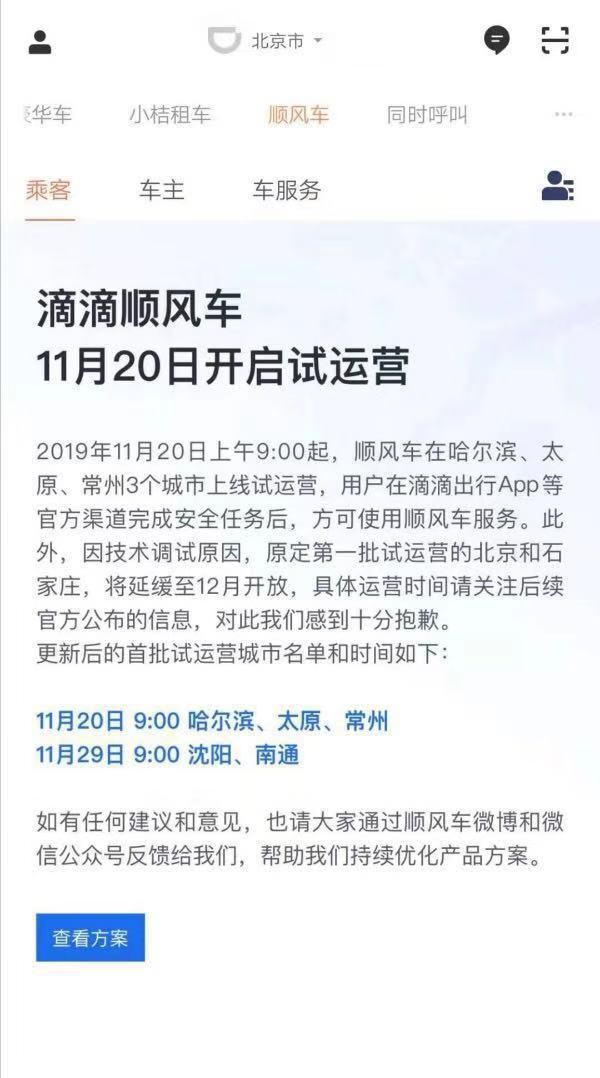 最前线 | 滴滴顺风车明早9点3城试运营,北京延期至12月