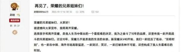 1月17日,荣耀CEO赵明在内网发布告别文章,表示“选择放手和离开荣耀,是人生当中做出的一个最艰难的决定”。他表示,公司4年成长需要系统性解决一些问题,很遗憾不能带领大家一起变革了。无论怎样,荣耀快速向前,是他最大的心愿。