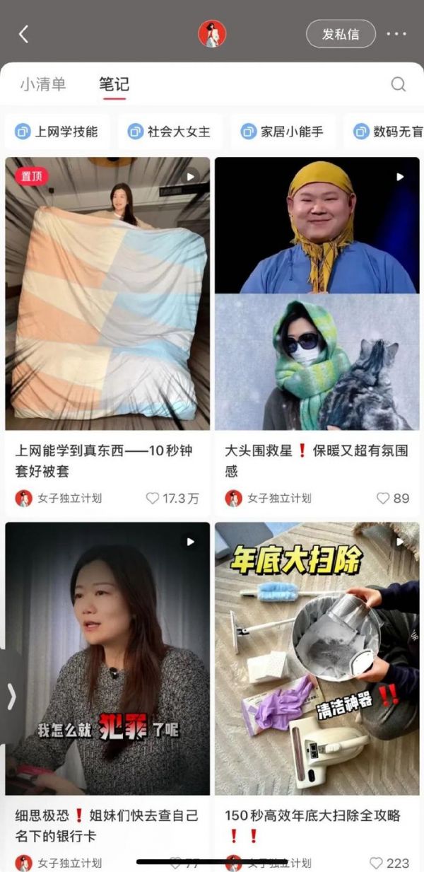 目前,君君的小红书账号@女子独立计划有23.5万粉丝,获赞和收藏超过240万。内容方面,君君将视频分为“上网学技能”“社会大女主”“家居小能手”“数码无盲区”“生活小妙招”等板块。