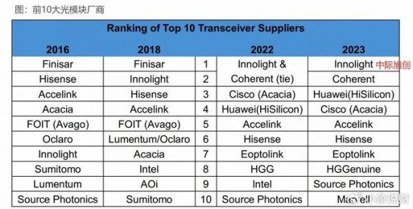 而且,在2022年的光模块厂商排名中,中际旭创还与Coherent并列全球第一。到了2023年,中际旭创直接超过Coherent,成功夺下全球第一的宝座。