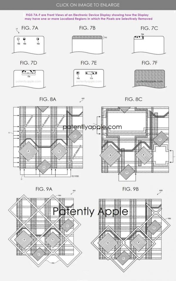 关于这方面,苹果最近获得的一项与屏下Face ID相关的新专利便提供了有力的技术支持。该专利描述了在屏幕下方放置光学传感器的方法,其中,屏幕上的“像素移除区域”与传感器部分重叠,为了提升光线透过率,专利提出了多种移除方案,包括移除像素移除区域的部分子像素来实现。
