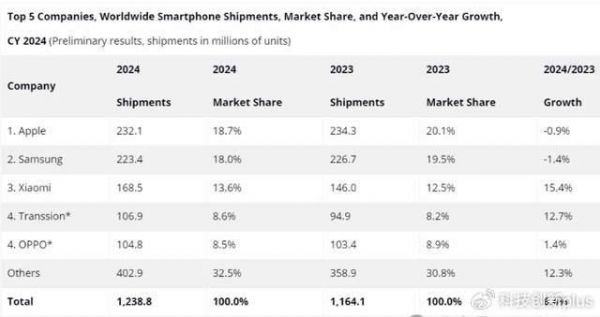 如上图所示,这是IDC发布了2024年数据,可以看到三星再次被苹果超过,份额为18%,而苹果为18.7%,比三星高了0.7%。