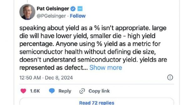 我们首先引出Intel 前任CEO Pat Gelsinger给出的一个专业解释,良率百分比并不是一个适合评价工艺良率的指标,因为同样良率的的工艺,在制造不同大小的芯片时会产生会有截然不同的良率。因此,如果缺乏一个足够的参考系,我们不能直接使用良率百分比这个指标。 举个例子,生产100mm2的芯片良率百分比是70%,那么生产600mm2的芯片良率百分比可能只有10%。 所以单独看这个百分比,但是不给芯片尺寸参考,没有任何意义。