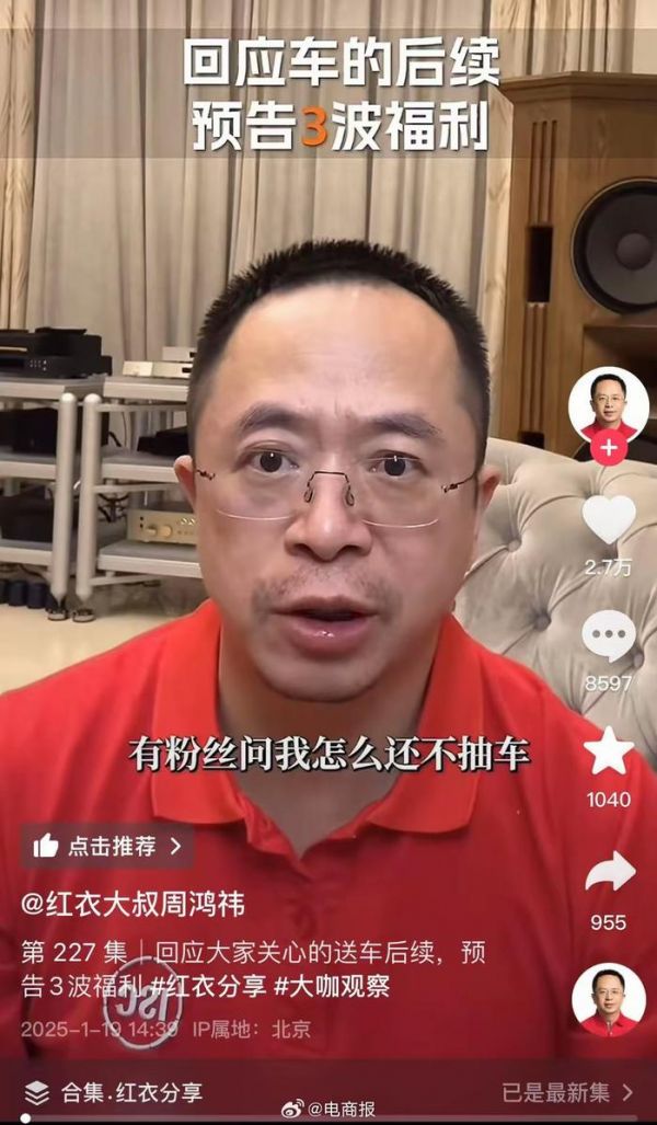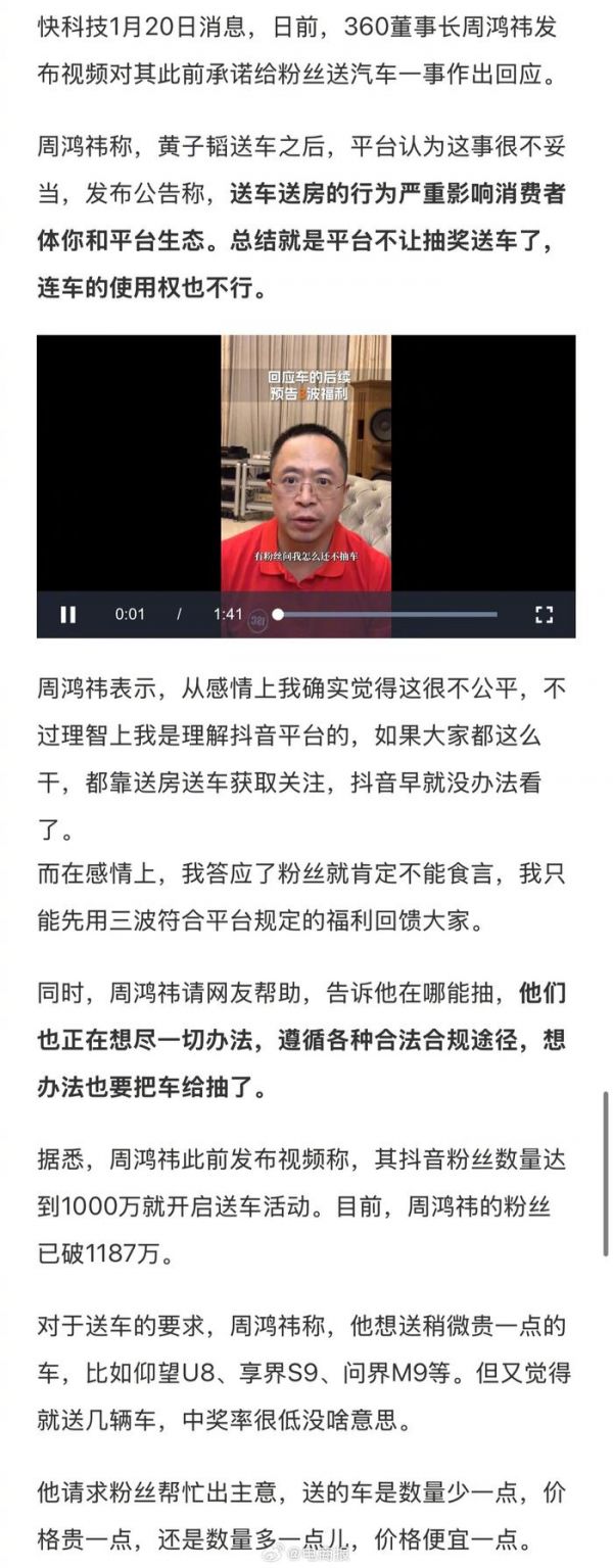周鸿祎回应送车后续:抖音不让抽奖送车了,会想尽一切办法把车抽了。
