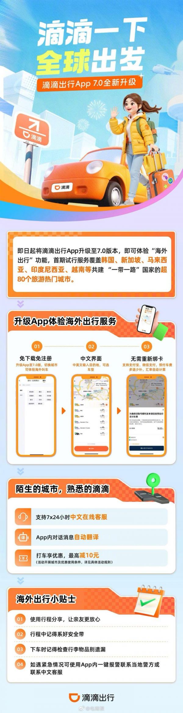 #出国漫游也能打滴滴了# 滴滴又有大动作!这次直接把业务拓展到了海外,在全球80个热门旅游城市上线海外出行功能,出国漫游也能像在国内一样轻松叫到车。说走就走的旅行,这下更丝滑了。