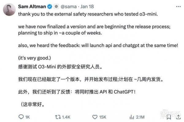 OpenAI CEO 萨姆·阿尔特曼宣布 o3 mini 推理 AI 模型即将发布