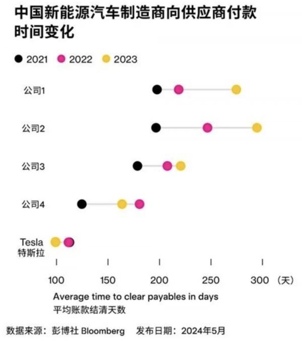 前不久,特斯拉全球副总裁陶琳在微博上晒出一张《中国新能源汽车制造商向供应商付款时间变化》的图片,数据显示特斯拉的平均账期结清天数在2023年已经下调至100天,其他主要公司的账期最长达到了300天,供应商资金回笼的艰辛可见一斑。